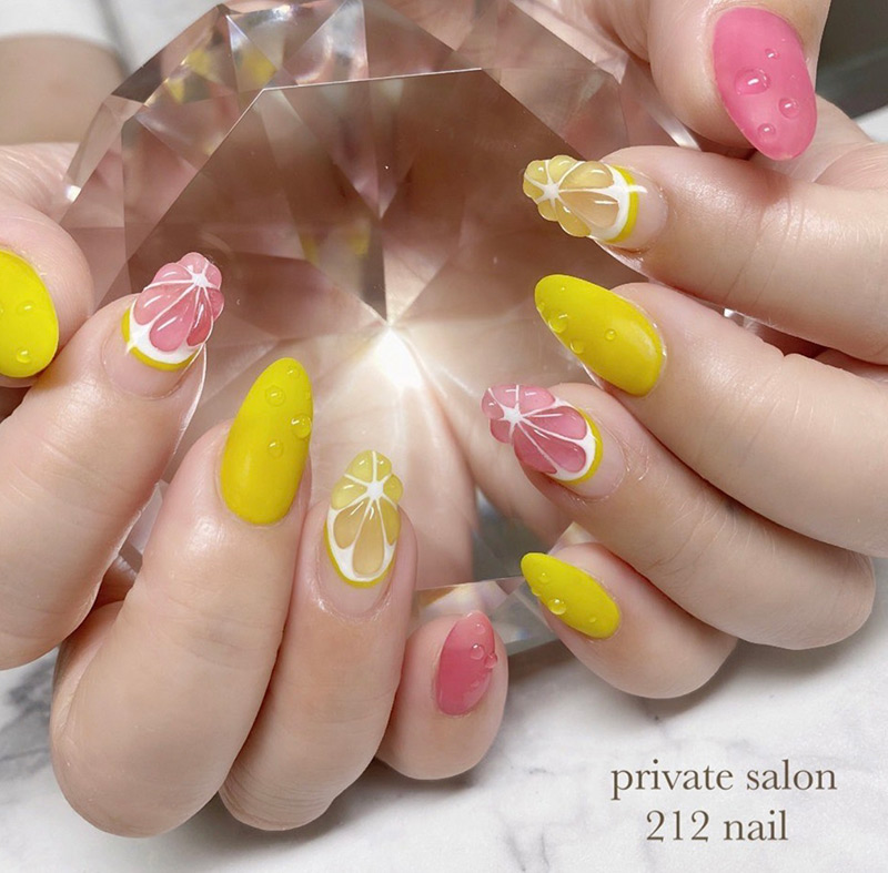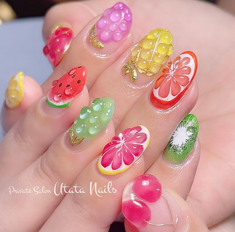 Lemons, pink grapefruits, pineapples and grapes are quite often painted on nails. Any fruit can be good for summer because the nail technician coats it with gel and it actually looks tropical. Some people make the fruits 3D as well.